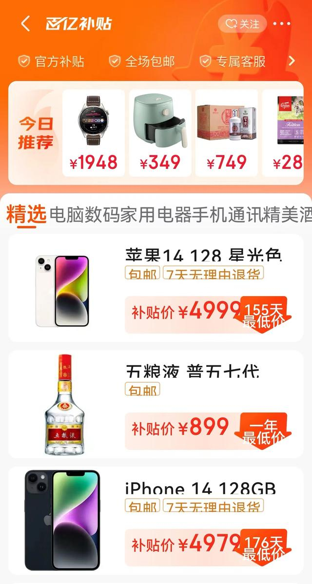 澎湃新闻记者观察到,3月3日,在京东APP上已经上线“百亿补贴”入口,搜索“百亿补贴”即可进入,该频道拥有一级入口,范围覆盖京东平台的全品类,自营和第三方商家都将参与其中。从价格来看,京东百亿补贴和拼多多的百亿补贴旗鼓相当,苹果iPhone 14 128GB版本价格为4999元,拼多多百亿补贴价为5099元;五粮液普五七代500ml价格为899元,京东标注为“一年最低价”;苹果iPad第九代价格为2289元,拼多多价格为2279元。