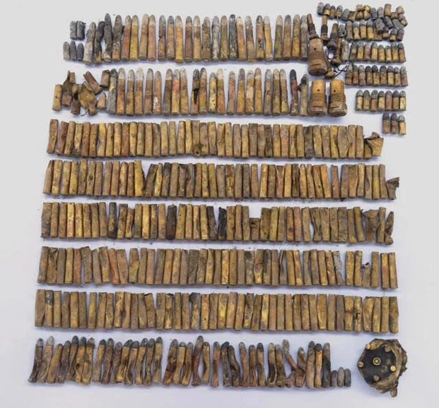 据介绍,该次发掘共出水各类文物201件,以铜制品最多,铁制品和木制品多为船体构件,皮革制品为鞋垫、胶垫。出水的弹药、瓷质洗涮盆、锅炉耐火砖、舷窗框等文物与其姊妹舰“致远”舰遗址一致,其中两箱完整的哈乞开司37毫米炮弹亦为国内首次发现。