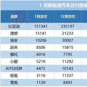 查看新能源车1月份的交付数据,除了理想之外,其他车企均有不同程度的下滑。其中零跑同比下降了85.91%,小鹏和哪吒分别同比下降了59.63%和45.35%。