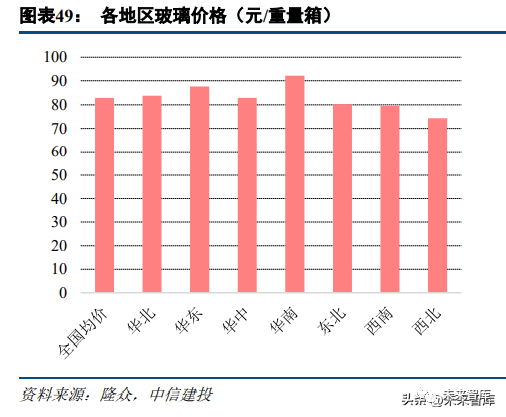 (3)燃、材料价格优势。公司是行业内少数全部产线使用天然气的企业之一,由于公司规模优势,每年有 大量且稳定的用气需求,与相关公司开展管道建设合作,享受管道直供气价格优势。若按照 0.5 元/立方米价格 优势计算,燃料成本优势在 4.0 元/重量箱左右。信义玻璃同样拥有原材料集采价格优势,一般情况下纯碱价格 比市场价低 10%左右。在纯碱价格 2700 元/吨的情况下,龙头企业玻璃生产所需纯碱成本比行业水平低 2.73 元/ 重量箱;在纯碱价格 2200 元/吨的情况下,龙头企业玻璃生产所需纯碱成本比行业水平低 2.22 元/重量箱。