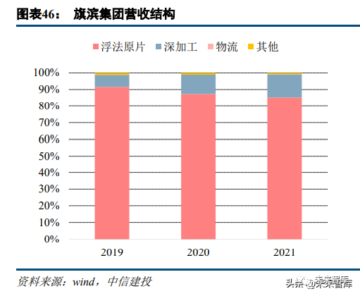 旗滨集团以浮法玻璃原片生产业务为主,2021 年该项业绩占比 85%。此外公司积极扩展深加工业务,占比 逐年提升,已由 2019 年的 7.19%提升至 2021 年的 13.95%。公司原片业务毛利率受到市场价格影响较大,景气 度高点时,公司浮法原片毛利率可以超过 50%,景气度低点时,浮法原片毛利率下滑至 20%以下。