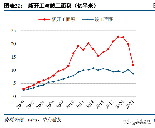 考虑到保交楼政策以及房企资金紧张缓解等因素,2023 年竣工面积有望恢复。2018 年以来,房屋新开工和 竣工面积出现了明显的背离,即使 2022 年地产投资和新开工面积负增长的情况下,待竣工面积仍有较多的存量。2022 年由于疫情、房企资金等因素影响,竣工面积同比下降 15%。我们判断 2023 年竣工面积与理论竣工面积的比例有望提升。一般新开工指标领先于竣工指标两年左右,我 们定义前置两年的新开工面积为理论竣工面积。