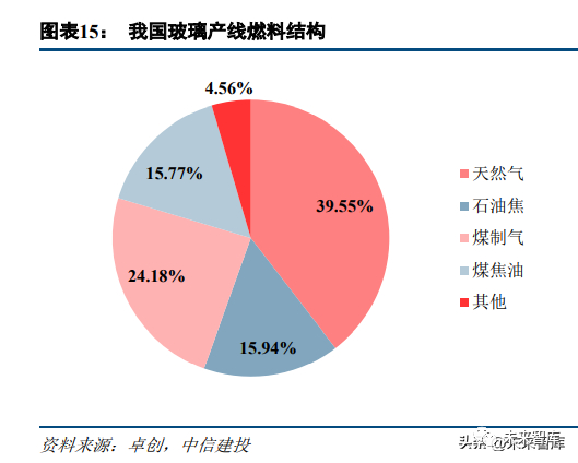 目前我国玻璃产线各类燃料均有一定份额,未来“煤改气”趋势将持续。目前,我国玻璃行业以天然气为燃料的产线占比约为 40%,以煤制气为燃料的占比约为 24%,以石油焦为燃料的占比约为 16%。在燃料选择上, 企业第一要考虑供应的稳定性,例如我国北方地区煤炭资源丰富,过去多数企业选择煤制气或煤焦油;第二要 基于玻璃品质的要求,例如超白玻璃、汽车玻璃品质较高,一般选用天然气进行生产;第三要考虑环保政策要 求,例如华北地区新建、改造产线逐步实现从天然气到煤质燃料的替代。