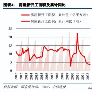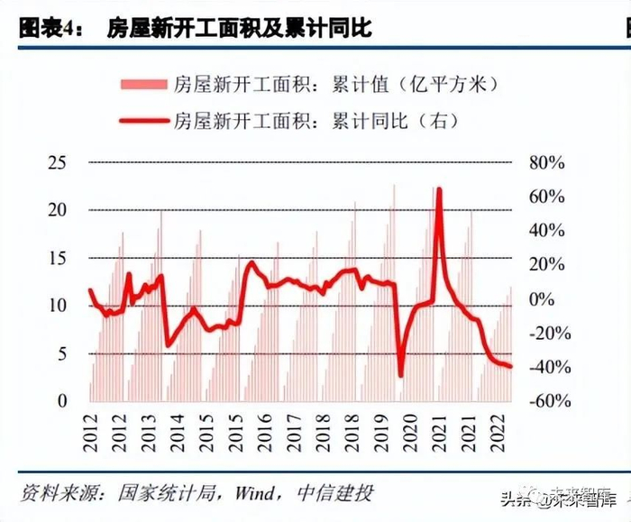 2022 年地产投资和开工端承压明显,增速处于历史低位。根据统计局数据,自 2022 年以来,房屋新开工 面积累计同比增速逐渐下滑,全年房屋新开工面积同比下降 39.4%至 12.06 亿平米。地产拿地速度大幅下滑,使 得土地购置面积增速下滑至历史低位,未来一段时间房屋新开工面积预计仍将维持下滑态势。2022 年购置土地 面积同比下降 53.4%至 1.01 亿平米。