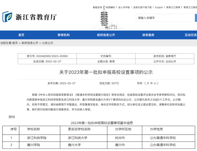 2月27日,浙江省教育厅发布《关于2023年第一批拟申报高校设置事项的公示》,浙江科技学院拟更名浙江科技大学、嘉兴学院拟更名嘉兴大学。