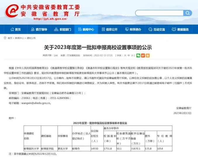 2月13日,安徽省教育厅发布《关于2023年度第一批拟申报高校设置事项的公示》,对拟向教育部申报的蚌埠医学院更名蚌埠医科大学事项予以公示。