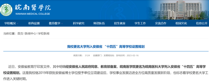 2月16日,据安徽芜湖“大江资讯”消息,安徽省教育厅近日印发文件,其中明确经安徽省人民政府同意、教育部备案,皖南医学院更名为皖南医科大学列入安徽省“十四五”高等学校设置规划。