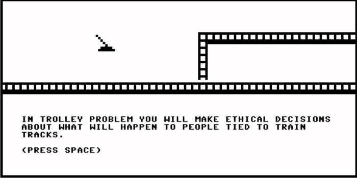 游戏开发者 Pippin Barr 有一个小游戏《电车难题》(Trolley Problem)便是其中一例,游戏中你需要为那个著名的思想实验做出你的选择:是看着列车开向并杀死三人,亦或是选择拉下轨道开关,让列车撞向另一条轨道的一人?最有趣的部分出现在游戏结尾,你需要再次地重新面临这一情景,但唯一的不同在于你需要先为那在铁道上的单独那一人指定一个身份,你的女儿、儿子、或其他的家人,然后再做出决定。而游戏不会对你的选择有任何的评论,而仅仅只会如同一面镜子将其呈现,并把思考留给你。
