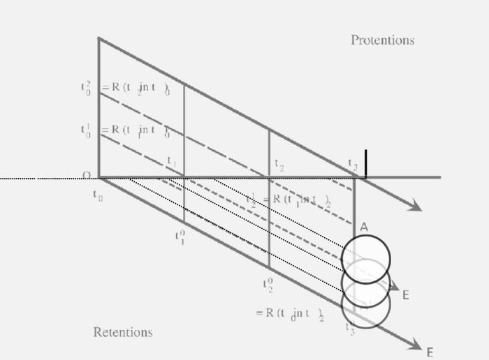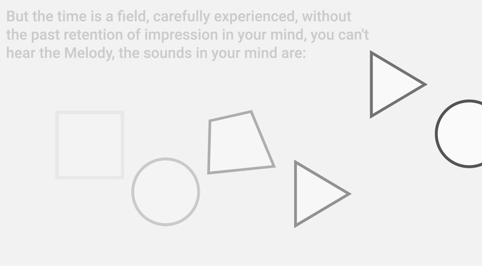 而在诸如“滞留(retention)”的场景中,我用屏幕上与声音与图像的出现与消失对应的现象学描述,作为当下时间体会的原初印象(primal impression)的呈现,随后用图像的残留和渐隐,来试图呈现出时间滞留的感受和胡塞尔著名的时间结构。