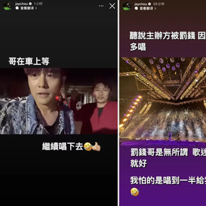 在得到对方“继续继续”的肯定答复后,周杰伦果真重回舞台继续唱歌,事后导致主办方因超时被罚钱。周杰伦在其个人社交媒体的限时动态表示:“罚钱哥是无所谓,歌迷开心就好”,随后还打趣说道:“我怕的是唱到一半给我断电。”