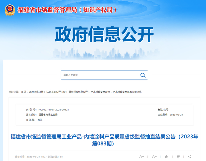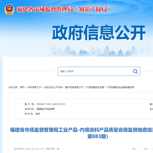 中国质量新闻网讯 福建省市场监督管理局网站披露,近期,依据《中华人民共和国产品质量法》和相关产品标准及抽查细则明确项目,福建省市场监督管理局组织对生产企业内墙涂料产品质量开展省级监督抽查。本次共抽查42家生产企业42批次,其中1批次不合格,不合格发现率为2.4%。