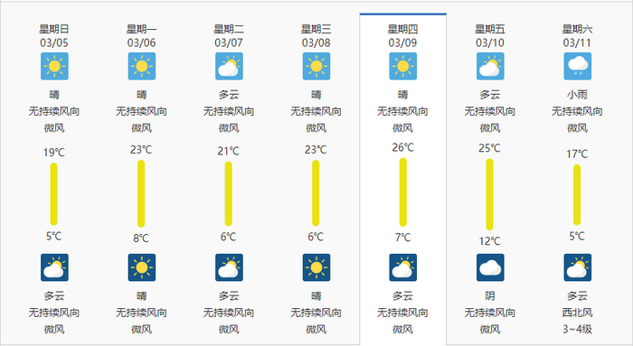 7日晚上到8日白天:多云转晴天,6℃~23℃。