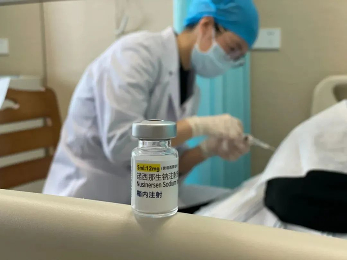 △2022年3月9日,肇庆一位10岁的脊髓性肌萎缩症(SMA)患儿注射诺西那生钠,这是70万每针天价救命药纳入医保降至3.3万元后,肇庆打出的首针。图源 肇庆医疗保障