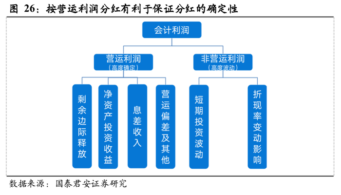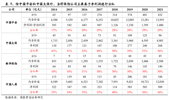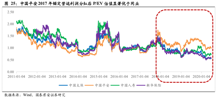 改变分红基础利好提振股价。以中国平安为例,确定的分红增速预期使个股从估值折价走向估值溢价。中国平安2011-2017年一直为估值折价,2017年后得益于提出按营运利润分红这一具有较高确定性的分红逻辑,相较同业出现明显的估值溢价。