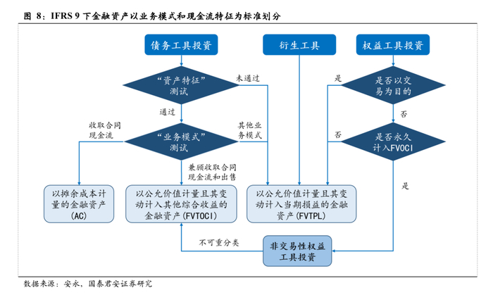 IFRS 9下金融资产以业务模式和现金流特征为标准划分,会计调节空间减小,报表的客观性显著提升。根据IFRS 9的分类规则,对于债务工具,首先进行“资产特征”测试(SSPI),通过测试后进行“业务模式”测试,如资产持有的目的是收取合同现金流,则计入AC;如资产持有的目的兼顾收取合同现金流和出售,则计入 FVOCI;其余情况计入FVTPL。对于权益工具,所有符合交易性金融资产特征的投资均计入FVTPL;此外有部分权益资产可选择永久性计入FVOCI。对于衍生工具,全部计入 FVTPL。