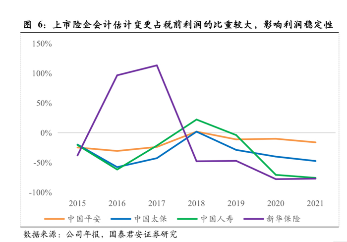 IFRS 17解决的问题之二在于提升利润表的透明度,缓解被操纵风险。在现有会计准则下,精算假设调整对未来利润的影响直接计入当期损益, 2015-2021年,四家主要上市险企会计估计变更占税前利润的比重平均达-24%,对当期利润的波动产生较大影响。实务中,保险公司对损益表有较大的自主调节空间,绝大多数保险公司将当期作出的有利精算假设调整确认为当期利润,利润表存在被操纵风险。