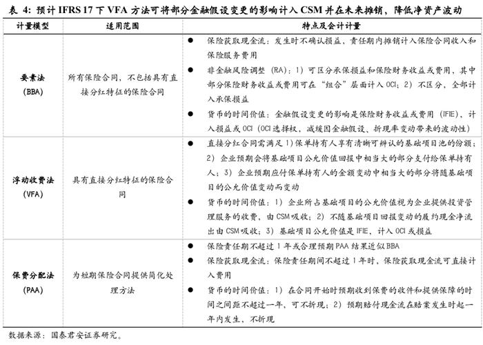 分红险业务采用VFA具有平抑净资产的功能,尤其在长端利率长期下行的大环境下,预计保险公司将加大分红险业务的占比。IFRS 17下,寿险合同有三种计量模型,分别是要素法(BBA)、浮动收费法(VFA)和保费分配法(PAA)。其中,对于直接分红合同,可采用 VFA计量方法,在VFA方法下,保险公司的分红险的盈利部分属于投资管理服务的收费,可作为CSM进行吸收,并在未来进行摊销,达到平滑当期净资产的效果。而对于大部分非直接分红的合同,需要采用BBA计量方法,金融假设变更的影响将计入损益表,在使用OCI选择权的情况下有部分金额可计入OCI,总体上对净资产的波动影响较大。考虑到国内当前正面临长端利率长期向下的大环境,预计后续无论是监管还是保险公司自身都将降低传统险的供给以避免利差损风险,分红险的占比预计将明显增加,较好平滑新准则下的净资产波动。