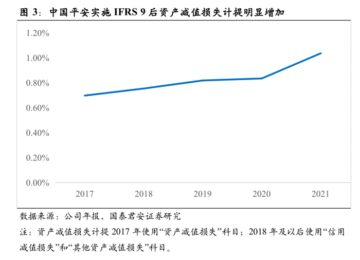 IFRS 9解决的问题之二是及时反映金融资产的预期损失,防止风险暴露不可控问题。现有会计准则对资产减值的宽容度较高,通常金融资产出现实际损失才被计提为资产减值损失,因此金融资产的风险暴露被大大延后了,这也是导致2008年国际金融危机爆发的重要原因之一。根据中国平安年报,公司实施IFRS 9后资产减值损失计提明显增加,当期资产减值损失计提占总资产的比重由2017年的0.70%提升至2021年的1.04%。