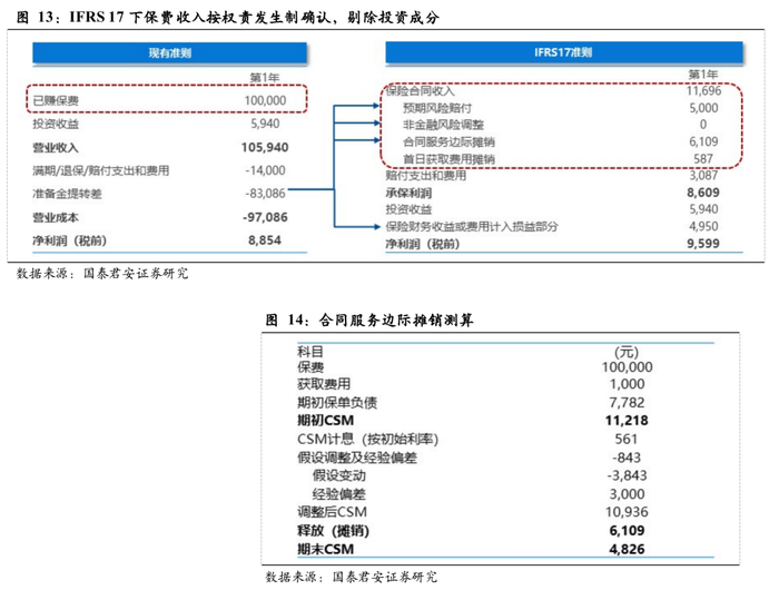 1) 保费收入确认上,IFRS 17下采用权责发生制,保险的预期服务在整个保险期间内逐步确认,即保费确认由原先按照缴费期计量转为未来按照保险期计量,与支出项当期的赔付和费用相匹配,体现为当期的保险风险净收入。