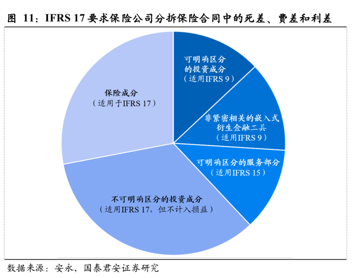 2) 保费收入计量上,IFRS 17要求保险公司必须分拆保险合同中可明确区分的投资成分和其他非保险服务成分,对于不可分拆的投资成分,其对应的保费也不得计入保险服务收入。也就是说,未来的保费收入仅涵盖死差和费差,不包含利差。