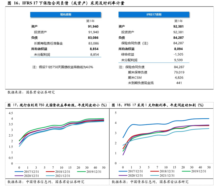 IFRS17要求保险公司的保险合同负债(或资产)及时反映利率市场及金融风险的变化,净资产的财务结果更为真实,同时波动也更剧烈。具体体现为,现行准则中的准备金计量采用750天移动平均曲线,而在新准则下负债计量的贴现率使用评估日的利率曲线(当前市场利率曲线),负债端准备金的计提会随即期利率的波动而大幅变化,从而导致资产负债表中净资产的波动加大。