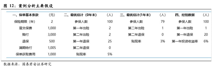 我们通过案例的方式说明保费确认的变化。假设2年期两全险,趸交保费1,000元,出险时赔付3,000元,满期给付1,005元,到期日前退保给付退保金500元,保单获取成本1,000元。于保单第一年初的最优估计是:参保人数100人,第一年出险2人,第二年出险2人,第一年退保25人,第二年退保0人,贴现率5%;于第一年末的最优估计是:参保人数79人,第二年出险1人,第二年退保0人,贴现率3%。从实际的经验数据来看,参保人数100人,第一年出险1人、退保20人、投资收益率6%。