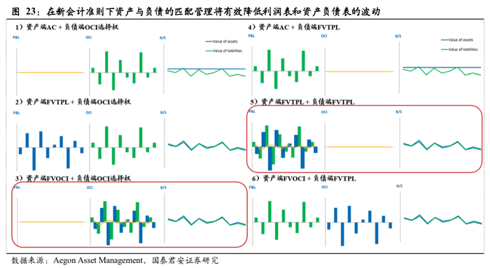 在IFRS 9和IFRS 17同步实施的背景下,资产端与负债端的匹配管理将有效降低利润表和资产负债表的波动。从负债端来看,IFRS17下保险公司负债端贴现率采用即期利率计量,评估利率曲线的频繁扰动将会造成利润和净资产的结果不确定性加大;从资产端来看,预计同步实施的IFRS9下更多资产将被归类为FVTPL,投资资产以市价计量的比重显著提升。考虑到IFRS17和IFRS9均侧重以市价计量,保险公司通过各账户间的资产负债匹配管理将有效缓解净利润和净资产受利率波动的影响。根据Aegon Asset Management的演示,保险公司采用资产与负债的会计计量方式匹配对缓解净利润和净资产波动最为有效。