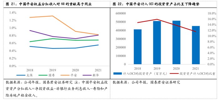 IFRS 9下大部分权益资产投资计入FVTPL预计将加剧利润表波动,保险公司适度增加高股息权益和长期股权投资等配置一定程度上缓解利润表波动。在IFRS 9影响下,保险公司为平抑利润表波动,预计将改变权益配置的结构,通过加大高股息权益和长期股权投资等配置来缓解利润表的波动。以中国平安为例,公司在2018年实施IFRS 9后增加高分红、低估值的权益投资,且逐步提升长期股权投资的占比,权益分红收入对净投资收益率的贡献高于持续同业。值得一提的是,中国平安并没有将增加投资资产计入OCI的比重作为降低利润波动的主要策略,2018-2021年计入OCI的投资资产占比由14.7%下降至11.5%,我们预计主要原因是将投资资产计入无法重分类至损益的OCI将无法体现投资业务对公司盈利的贡献,管理层的意愿较低。