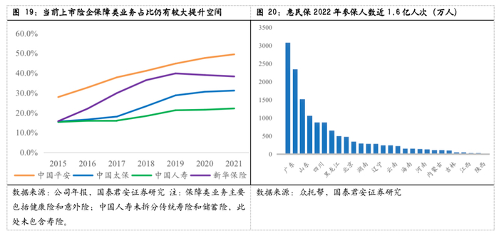 权责发生制下保费收入预计大幅下降,增加保障类业务占比将有效提升保费收入。IFRS 17采用权责发生制将重新进行寿险公司保费收入的确认,一方面保费收入确认的时点会延后;另一方面储蓄险、分红险、投连险、万能险等投资成分无法计入保费,保费收入面临大幅下降。当前各家上市保险公司保障类业务的占比仍然偏低,普遍不到50%,其中2020年以来受制于普惠类保险的出现一定程度上替代了商保满足了居民的保障需求。随着普惠类产品影响的钝化,结合“保险姓保”的监管导向,预计未来保险公司将更加关注客户的保障类需求,推出能够解决客户个人卫生费用支出过高的保障型产品,有效缓解IFRS 17对保费收入造成的冲击。