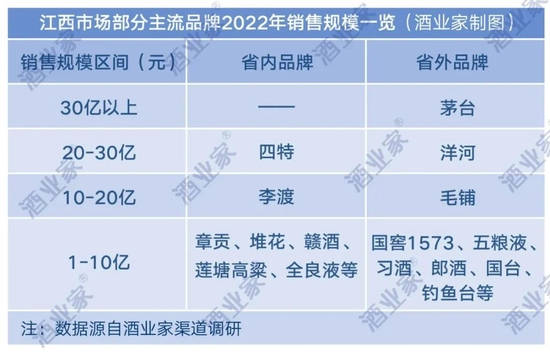 与之相对应的则是省外品牌的突飞猛进,酒业家通过渠道调研获悉,在江西市场,茅台一骑绝尘,洋河去年销售额已触及20亿元大关,毛铺在江西市场的年销售额也稳定在10亿元以上。此外,国窖1573在高端价格带竞争力较强,约有3-5亿元的规模;习酒、郎酒、国台、钓鱼台等一线酱酒品牌也均有不错的收获,销售规模都在2-3亿元左右。
