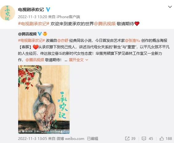 此前,2022年11年,腾讯视频发布“2023年鹅厂片单”,官宣将拍亦舒同名小说《承欢记》,并未官宣演员阵容。