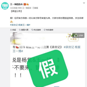王一博后援会晒出“爆料杨紫王一博将出演《承欢记》”的截图打假:假!任何官方信息一切以官方账号官宣为准,大家勿信勿理造谣信息,关注自家。