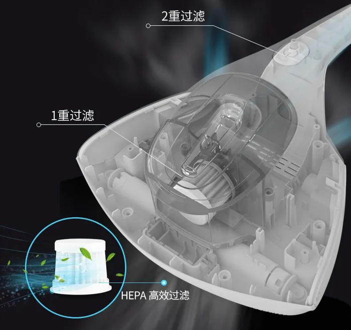 除螨仪内置一枚专业的HEPA滤芯,能过滤大部分的灰尘颗粒和悬浮物,释放出干净空气。