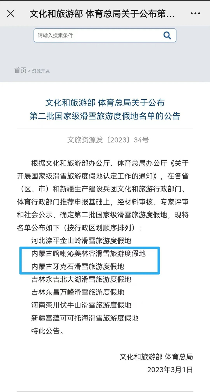 近日,内蒙古赤峰市喀喇沁美林谷和呼伦贝尔市牙克石滑雪旅游度假地被国家文化和旅游部、国家体育总局联合认定为国家级滑雪旅游度假地,成为继呼伦贝尔市扎兰屯荣获首批国家级滑雪旅游度假地后,关于冰雪旅游获得的又一项国家级品牌。
