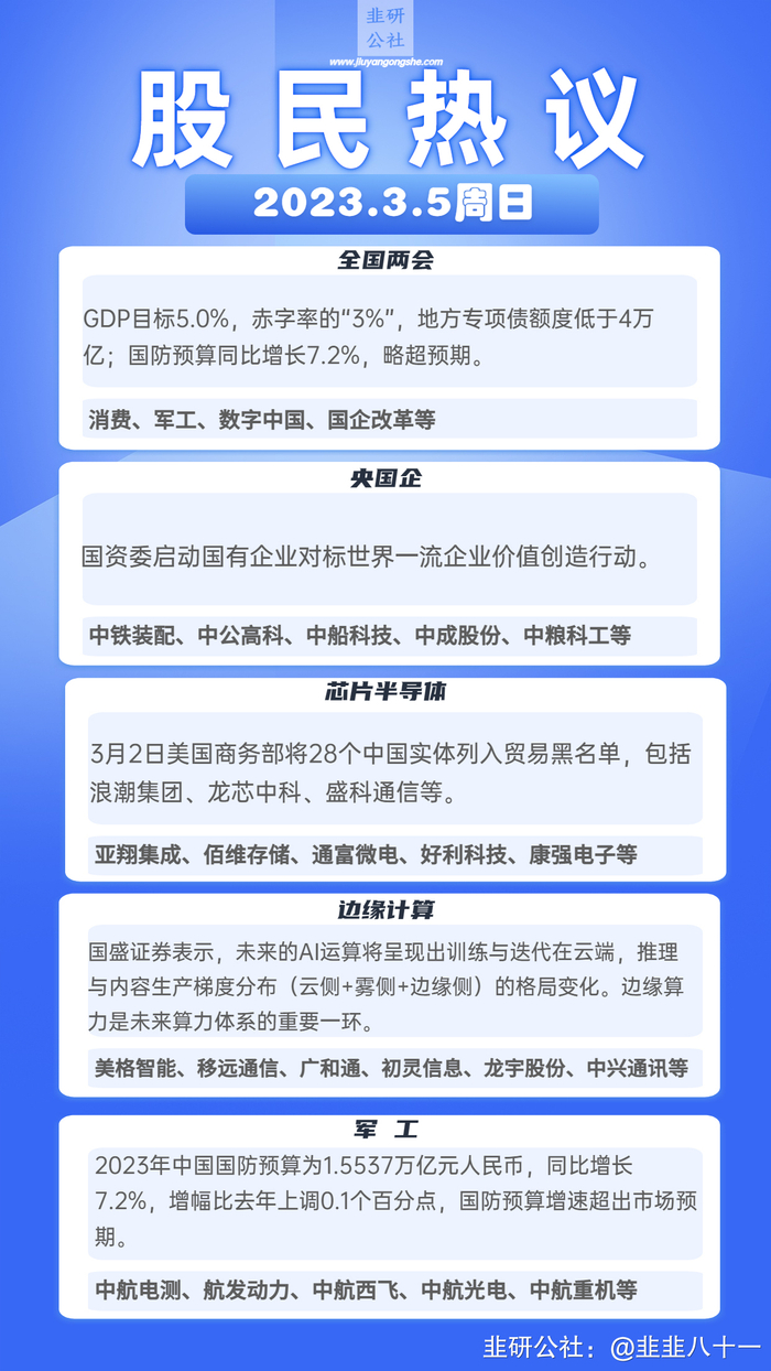 一、公社热议:1、全国两会:2、央国企:3、芯片半导体:4、边缘计算:5、军工: