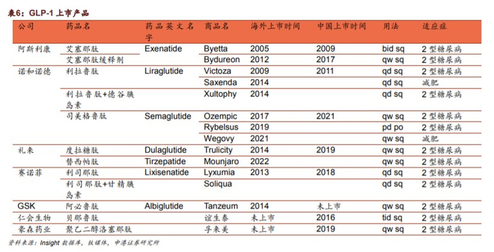 国内企业中,GLP-1类创新药目前已上市的仅有仁会生物的贝那鲁肽和江苏豪森的聚乙二醇洛塞那肽,均应用于二型糖尿病治疗。其他厂商中,信达生物(01801.HK)、甘李药业(603087.SH)、石药集团(01093.HK)、先为达生物、恒瑞医药(600276.SH)、东阳光生物等GLP-1类创新药仍在临床试验中。