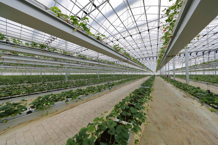 人勤春更早。负责种苗、施肥、采果的果农在草莓园里有说有笑,分工细致,眼前一派繁忙景象,草莓园里,悬空错落的种植架最大利用了空间。
