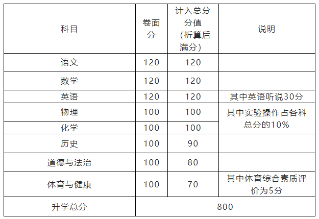 答:录取计分科目为语文、数学、英语、物理、化学、道德与法治、历史、体育与健康共8科,满分为800分。具体见下表:
