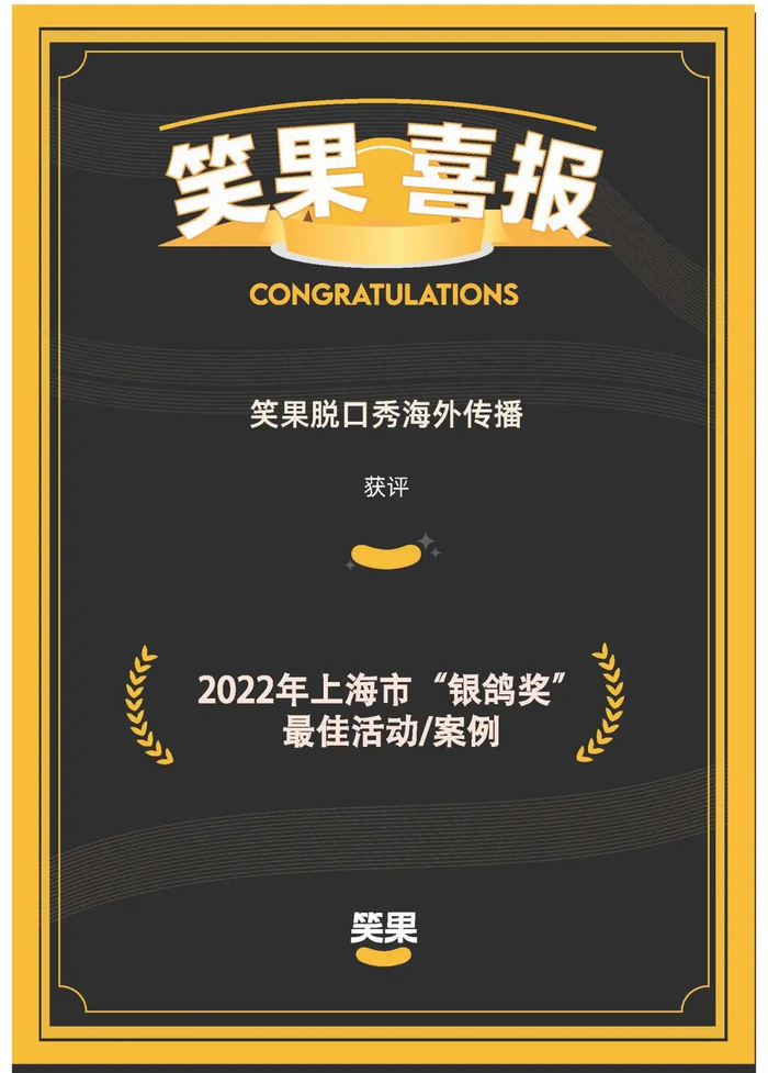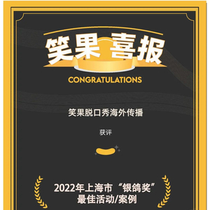 近日,2022年上海市“银鸽奖”评选结果揭晓,笑果文化报送项目“笑果脱口秀海外传播”荣获最佳活动/案例。喜讯传来的当下,正值这家以内容为驱动的年轻态喜剧产业公司刚刚圆满完成中国脱口秀的首次大型北美巡演。脱口秀正在成为上海的一张城市文化新名片。