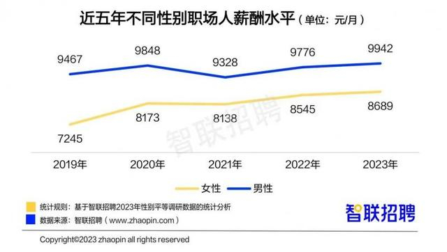从薪酬来看,2023年,女性的平均薪酬为8689元/月,与男性的9942元/月相差1253元,总体来看,男女薪酬差距成逐年缩窄趋势。2019年,女性比男性月薪低23.5%,2023年相差约12%。一定程度说明女性的职场价值日益得到更多认可。