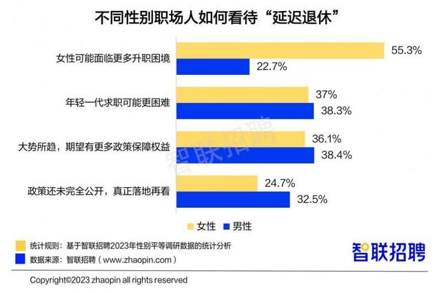 2023年,“延迟退休”成为热门话题,55.3%的女性对此表示担忧,认为“升职竞争可能更激烈,女性面临更多困境”,而抱有同样观点的男性仅占22.7%。这表明,这一政策变化对女性的影响让女性自身感受更强烈。也分别有37%、36.1%的女性认为“年轻一代求职可能更困难”、“希望出台配套政策保障职场人权益”,有同样看法的男性占比基本持平。