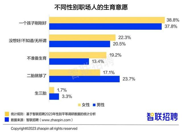 “三胎”政策推行已近2年时间,但“只生一个好”仍是广大职场人的共识。愿意生三胎的女性仅占1.7%,男性的意愿强于女性,占3.3%。38.8%的女性只愿生一个孩子,排名各选项第一,并高于去年的35%。