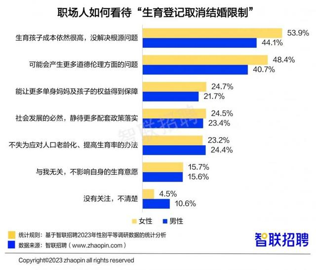 最近,四川省“生育登记取消结婚限制”冲上热搜。对于这一政策,职场女性看法不一。53.9%的女性认为“生育孩子成本依然很高,没解决根源问题”,占比高于男性的44.1%,48.4%的女性认为“可能会产生更多道德伦理方面的问题”。也有女性对此报以乐观态度, 24.7%认为“能让更多单身妈妈及孩子的权益得到保障”,23.2%的女性认为该政策“不失为应对人口老龄化、提高生育率的办法”。
