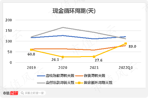 公司现金循环周期先降后升,2022年前三季度为89天,压力不大。其中,存货周转天数表现比较平稳。