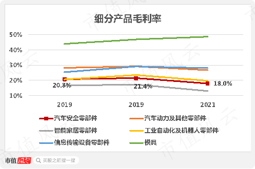 分产品看,占比最高的汽车安全零部件毛利率处于中游。最赚钱当属模具,2021年毛利率达48.5%。智能家居零部件有些拖后腿,同期仅为12.9%。