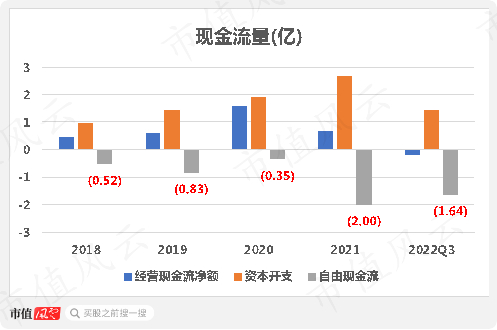 2018-2022年前三季度,公司经营性现金流净额累计为3.1亿,同期资本开支为8.5亿,自由现金流净流出5.4亿,持续失血。