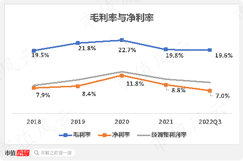 净利率与毛利率走势基本一致,2022年前三季度为7%。