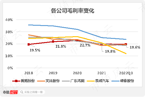 虽然各公司的产品结构不尽相同,但近年来毛利率整体呈下降趋势。公司毛利率水平从最低,维持到与大家持平,2022年前三季度为19.6%。