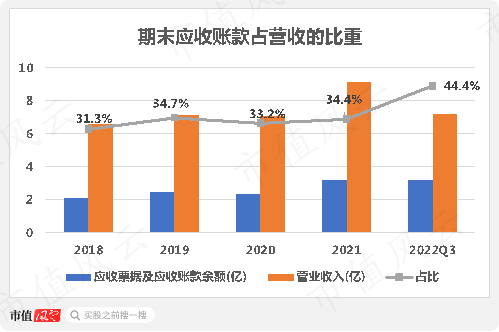 近年来,期末应收帐款余额占总营收的比重逐渐增高,2021年末为34.4%,并且前五大客户的赊账比例也越来越高。