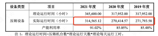 但在产能利用率上有些让人摸不着头脑,公司表示压铸设备利用率可以充分体现其主营产品产能利用率,并披露压铸设备2021年实际运营时间为31.4万小时,也就是日均工作861.8小时。